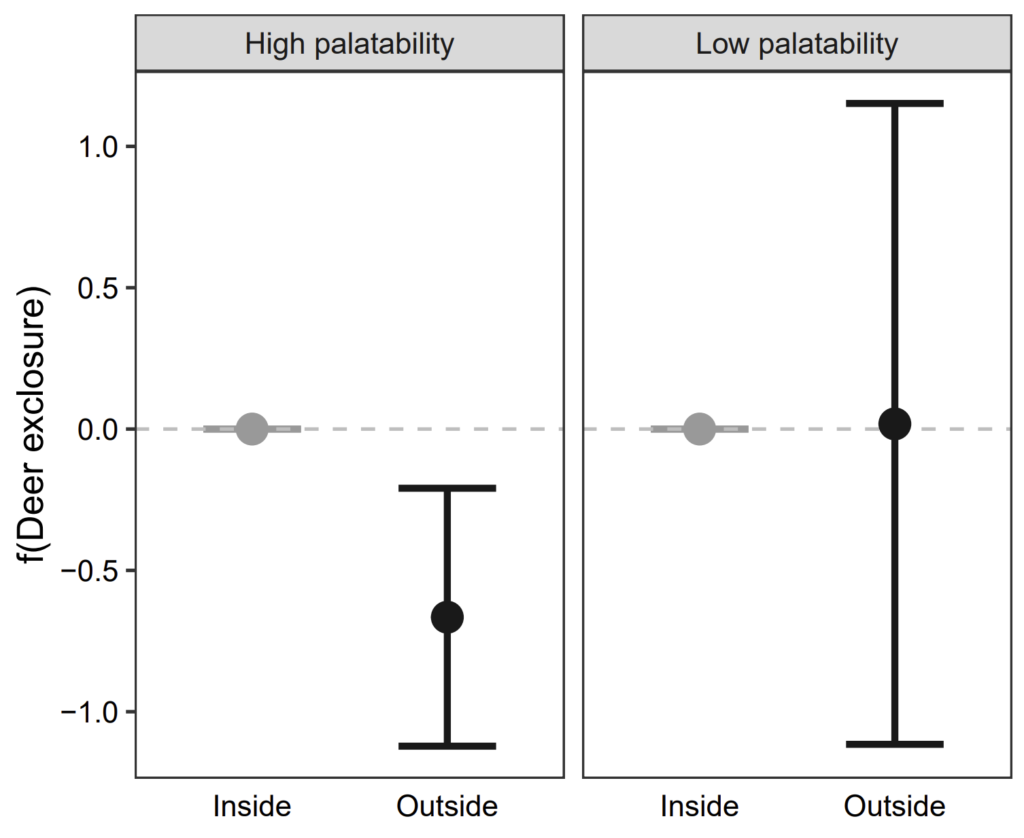 Finally, the negative effect of ungulates browsing on post-disturbance regeneration was evident from our exclosure experiment. Regeneration of highly palatable species had significantly lower heights outside the exclosures compared to inside, which underscores that, if we aim to recruit these species into the canopy, thus maintaining species diversity in the stands, interventions to reduce deer abundance are needed in areas with particularly high populations.