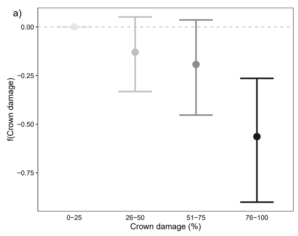 When comparing radial growth of canopy trees that survived the compound event, we found that their growth over a period of 6 years after the ice storm was equal or greater than in the period before the event. In particular, broadleaf trees with the crown damaged up to 75 % did not show evidence of consistently lower growth than undamaged trees.