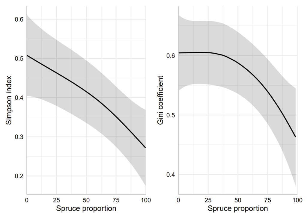 The proportion of spruce before the disturbance was the main driver of both structural and species diversity after the compound event, even when accounting for the differences in pre-disturbance diversity. More interestingly, structural diversity abruptly dropped above 50 % of spruce in the stand composition, highlighting the greater resilience of mixed forests in contrast to spruce monocultures.